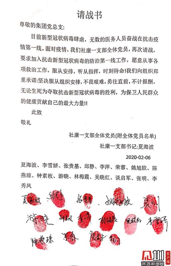 見圳客戶端·深圳新聞網(wǎng)訊(記者 董非)“讓黨旗在防控斗爭第一線高高飄揚(yáng)。”新冠肺炎疫情發(fā)生以來,南山區(qū)醫(yī)療集團(tuán)總部黨員勇當(dāng)先鋒,以實(shí)際行動踐行初心使命,涌現(xiàn)出眾多感人故事,展現(xiàn)了共產(chǎn)黨員的風(fēng)采與擔(dān)當(dāng)。 疫情發(fā)生后,南山區(qū)第一時(shí)間制定出臺了《黨建引領(lǐng)疫情防控工作五項(xiàng)行動方案》,南山區(qū)委書記王強(qiáng)號召全體黨員,發(fā)揮黨組織的戰(zhàn)斗堡壘作用和黨員的先鋒模范作用,全力保障人民群眾生命安全和身體健康,讓黨旗在防控疫情斗爭第一線高高飄揚(yáng),堅(jiān)決打贏疫情防控人民戰(zhàn)爭、總體戰(zhàn)、阻擊戰(zhàn)。南山區(qū)醫(yī)療集團(tuán)總部積極響應(yīng),黨建引領(lǐng)下的防控抗疫工作有序科學(xué)地展開。 今年1月底,深圳市南山區(qū)區(qū)委授旗成立南山醫(yī)療系統(tǒng)黨員突擊隊(duì)。南山區(qū)醫(yī)療集團(tuán)總部緊急組建了防控新冠肺炎應(yīng)急突擊隊(duì),僅一天內(nèi)區(qū)醫(yī)療集團(tuán)就共有169人完成第一批應(yīng)急突擊隊(duì)報(bào)名,其中黨員過半數(shù)。 疾風(fēng)知勁草,烈火煉真金。一封封請戰(zhàn)書閃電匯聚到黨總支,召即來,來能戰(zhàn),戰(zhàn)能勝,沖鋒在前就是擔(dān)當(dāng)?shù)淖蠲姥堇[;一位位黨員迅速入隊(duì)黨員突擊隊(duì),他們重溫入黨誓言,在黨旗下實(shí)踐著醫(yī)者仁心、人間大愛;一份份入黨申請書紛沓而來,特殊時(shí)期經(jīng)受特殊考驗(yàn),一批優(yōu)秀的醫(yī)護(hù)人員頁主動向黨組織靠攏。鏗鏘的語言、堅(jiān)定的決心、舍我的擔(dān)當(dāng),是南山區(qū)醫(yī)療集團(tuán)總部廣大黨員逆行而上、抗擊疫情的堅(jiān)定決心和必勝信心。 最美逆行黨支部,積極請戰(zhàn)敢擔(dān)當(dāng) “我是共產(chǎn)黨員,我請戰(zhàn)!愿為戰(zhàn)勝疫情全力以赴!”這是南山區(qū)醫(yī)療集團(tuán)總部一支部13名黨員和2名入黨積極分子聯(lián)名撰寫的《請戰(zhàn)書》(節(jié)選)。 面對新冠肺炎疫情,一支部黨員在夏海波支部書記夏海波的帶領(lǐng)下,在發(fā)熱門診、發(fā)熱患者預(yù)檢分診、社區(qū)“三位一體”排查等工作中,積極發(fā)揮共產(chǎn)黨員戰(zhàn)斗在一線、沖鋒在一線的模范帶頭作用,為戰(zhàn)勝新冠肺炎疫情全體黨員積極主動請戰(zhàn),并向集團(tuán)黨總支遞交了請戰(zhàn)書。 社康一支部全體黨員的請戰(zhàn)書 一個(gè)個(gè)紅手印,令人淚目,彰顯著南山區(qū)醫(yī)療集團(tuán)總部白衣天使們逆行而上的使命擔(dān)當(dāng)和責(zé)任意識。 一支部書記夏海波說,“成為疫情防控工作第一線發(fā)展黨員,是面對疫情充分發(fā)揮黨員先鋒作用的具體實(shí)踐。此次請戰(zhàn),將更加激勵(lì)他們我們在今后的工作特別是近期防疫防控工作中,以黨員的標(biāo)準(zhǔn)嚴(yán)格要求自己,發(fā)揮黨員先鋒模范作用。同時(shí),也會對全院全體員工產(chǎn)生積極引領(lǐng)、鼓舞作用,以更飽滿的斗志投入防疫防控工作?!?/p> 老黨員重溫入黨誓詞,面對黨旗表決心 “我宣誓:我志愿加入中國共產(chǎn)黨……”這是一次特別的宣誓。接到組織號召后,社康二支部的老黨員鐘達(dá)宏和吳麗娉,對著黨旗,以重溫入黨誓詞的方式,不忘黨員初心,牢記使命,積極沖鋒在前,誓要打贏防控狙擊戰(zhàn)。 社康二支部的老黨員鐘達(dá)宏和吳麗娉,對著黨旗,重溫入黨誓詞,誓要打贏防控狙擊戰(zhàn) 面對來勢洶洶的疫情,南山區(qū)醫(yī)療集團(tuán)總部的黨組織和黨員干部不但沒有被嚇倒,反而激起了他們昂揚(yáng)的戰(zhàn)斗意志和飽滿的工作熱情。 “我宣誓,我自愿加入抗擊新型冠狀病毒肺炎疫情防控工作隊(duì)伍,責(zé)任上肩,聽黨指揮,服從命令,科學(xué)應(yīng)對,恪盡職守,努力守護(hù)轄區(qū)居民健康,堅(jiān)決打贏疫情防控攻堅(jiān)戰(zhàn)!”守土有責(zé)、守土擔(dān)責(zé)、守土盡責(zé),所有社康中心的黨員干部將筑牢抗疫的基層防線,誓要守護(hù)轄區(qū)居民的生命健康。 社康二支部黨員在黨旗下宣誓努力守護(hù)轄區(qū)居民健康 艱難時(shí)刻主動請戰(zhàn),夫妻雙雙奮戰(zhàn)一線 1月26日,南山區(qū)醫(yī)療集團(tuán)總部下發(fā)關(guān)于組建防控新型冠狀病毒感染肺炎應(yīng)急突擊隊(duì)報(bào)名的通知。除了得到集團(tuán)黨員們的積極響應(yīng)之外,各個(gè)支部涌現(xiàn)出一波遞交入黨申請書的小高潮。 李婧是社康支部的一名全科醫(yī)生,一直在社康醫(yī)院中心從事全科醫(yī)療工作,戰(zhàn)“疫”的號角吹響,李婧第一時(shí)間參戰(zhàn),在所有抗疫時(shí)期入黨人員里第一個(gè)遞交了手寫入黨申請書。 李婧醫(yī)生的手寫入黨申請書 起初,她所在的蔚藍(lán)海岸社康中心考慮到李婧的愛人是深圳市公立醫(yī)院急診科醫(yī)生其愛人是深圳市某公立醫(yī)院的急診科醫(yī)生,疫情發(fā)生以來一直堅(jiān)守在崗位上,家中尚有1歲零3個(gè)月的寶寶,就沒有讓她參加社區(qū)“三位一體”排查和酒店留守值班等一線工作和醫(yī)學(xué)觀察點(diǎn)留守值班等一線工作。李婧得知后,她主動提交請戰(zhàn)書、舍小家顧大家,并沒有因?yàn)樯钌系睦щy而有所退縮,主動要求參與疫情排查