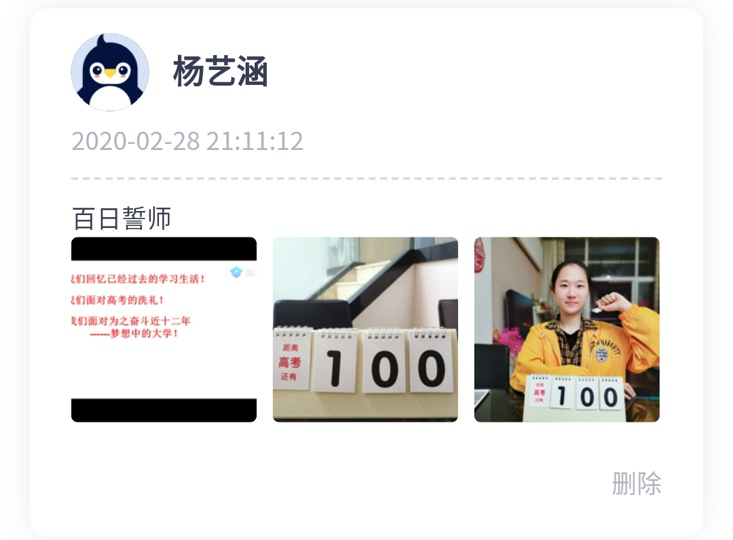 “生于非典,考于新冠,2020,我們注定不凡!疫情當前,雖然我們隔離在家,不能像往屆那樣,齊聚學校體育館舉行誓師大會,意氣風發(fā)地走進學校精心準備的“成功門”,伴隨奮進的樂聲高喊出我們的誓言,在“簽名紀念墻”上寫下對未來的期盼。但即使相隔網(wǎng)絡兩端,我們依然有老師祝福和引導,有家長的鼓勵和支持,有同窗的幫助和陪伴,高考百日,我們?nèi)栽谝黄鹫癖鄹吆簦?020高考,我們準備好了?!?/p>