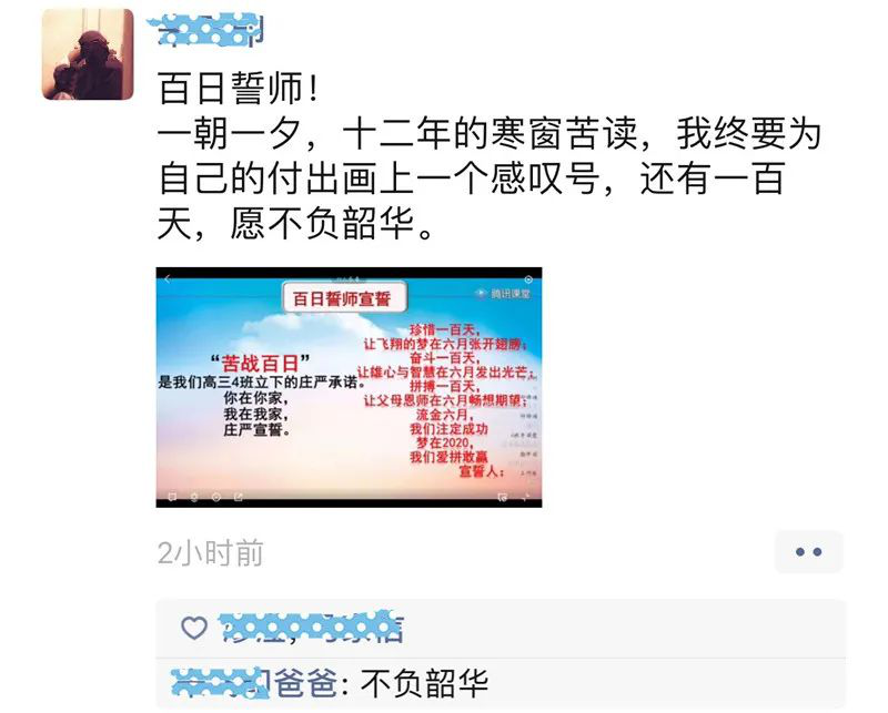 高三(10)班劉欣頤媽媽的留言也贏得了孩子們點贊:“親愛的孩子們,在這最苦難時期,請堅持你們的奮斗目標和理想,不要退縮、勇往直前。許多事情,堅持堅持就過來了。人生就是一場修行,再苦再累,只要朝著自己努力的奮斗目標,屬于你的終究會出現(xiàn)。不負韶華方得始終,夢想永遠屬于努力奮斗的人。加油吧,少年!”