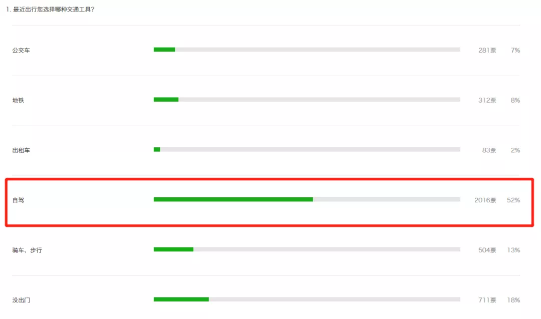 據(jù)不完全統(tǒng)計(jì),現(xiàn)如今52%的市民出行選擇的交通工具為自駕,選擇公交、地鐵以及騎車(chē)、步行的人數(shù)加起來(lái)僅占28%。