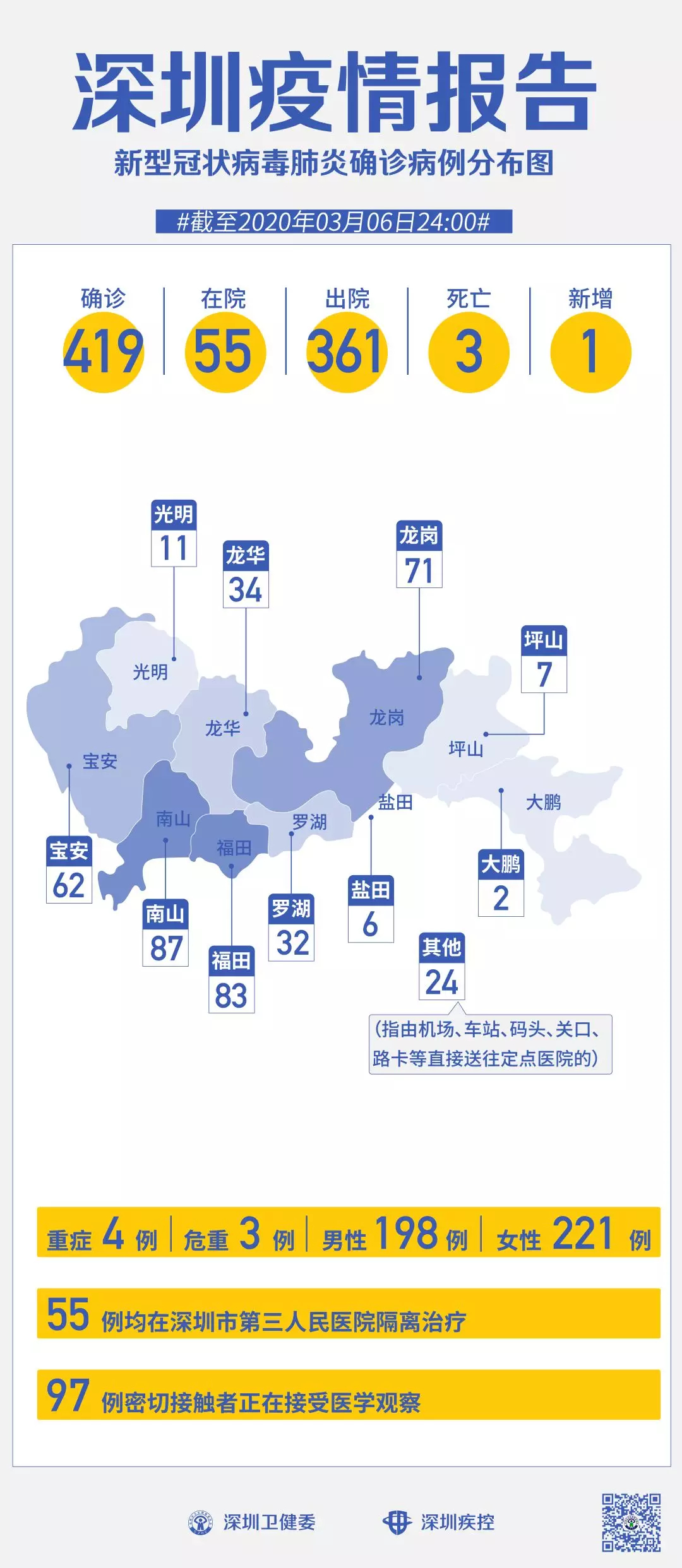 按照病例管理地區(qū)劃分,南山區(qū)87例、福田區(qū)83例、龍崗區(qū)71例、寶安區(qū)62例、龍華區(qū)34例、羅湖區(qū)32例、光明區(qū)11例、坪山區(qū)7例、鹽田區(qū)6例、大鵬新區(qū)2例、其他(指由機(jī)場、車站、碼頭、關(guān)口、路卡等直接送往定點(diǎn)醫(yī)院的)24例。