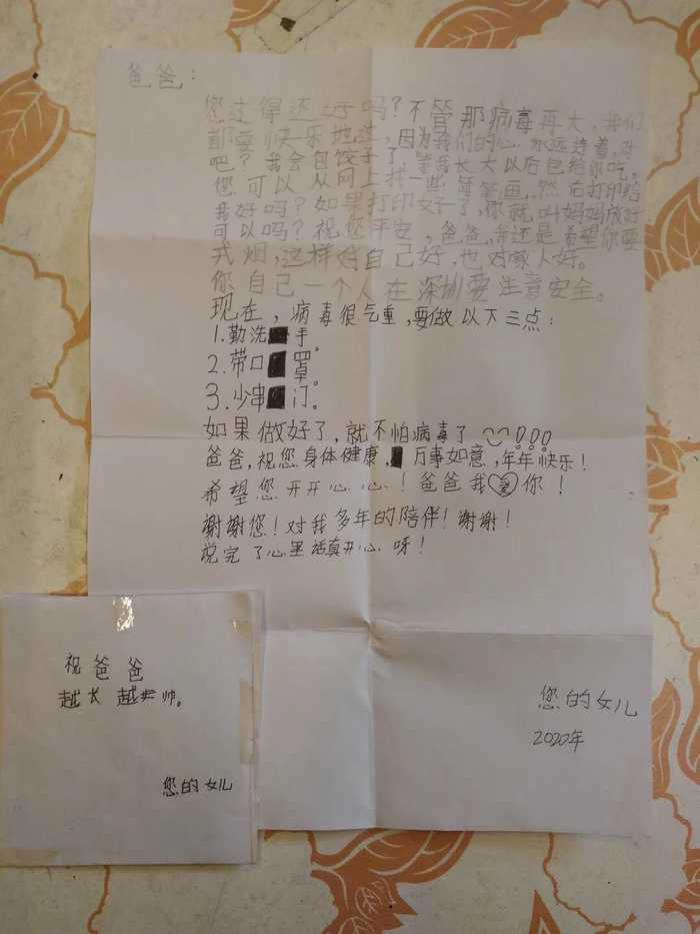 深圳晚報2020年3月9日訊 "爸爸:您過得還好嗎?不管那病毒再大,我們都要快樂地過,因?yàn)槲覀冃倪B在一起……"日前,白云飛收到一封9歲女兒白家茵在高州老家給他郵寄的信件??粗畠喊l(fā)來的一行行文字,白云飛動容地說道,"原本答應(yīng)她過年帶她去沙灘,聽到我說要提前回深圳與病毒作斗爭,還叮囑我一人在外注意安全。"紙短情長,他感覺自己的女兒長大了,他為女兒的堅強(qiáng)懂事而感動和自豪。"由于工作原因,爸爸需要提前回到工作崗位。等疫情過后,爸爸也抽時間好好陪你一下哈……"白云飛字里行間寫下了對女兒的愧疚之情。
