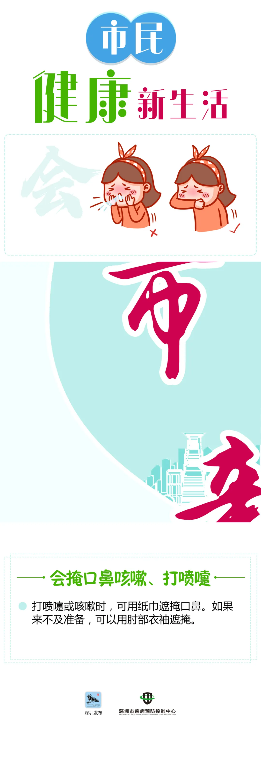 打噴嚏或咳嗽時(shí),可用紙巾遮掩口鼻。如果來不及準(zhǔn)備,可以用肘部衣袖遮掩。