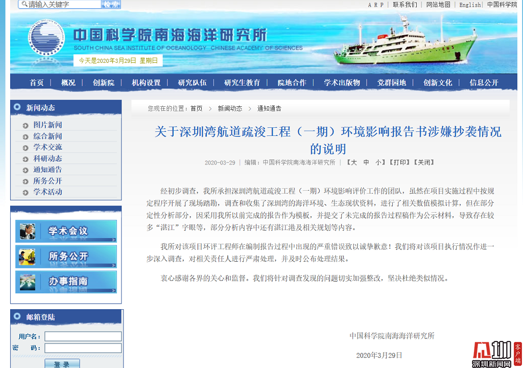 見圳客戶端·深圳新聞網(wǎng)2020年3月29日(見圳客戶端、深圳新聞網(wǎng)記者 鐘鴻冰)3月29日,中國科學(xué)院南海海洋研究所在官網(wǎng)發(fā)布說明稱:深圳灣航道疏浚工程(一期)環(huán)境影響評(píng)價(jià)工作雖按規(guī)定進(jìn)行了現(xiàn)場(chǎng)踏勘,調(diào)查并收集了有關(guān)資料等環(huán)節(jié),但因采用其以前的報(bào)告作為模板,并將未完成的報(bào)告作為公示材料,導(dǎo)致公示的環(huán)評(píng)報(bào)告中出現(xiàn)多處錯(cuò)誤。南海海洋研究所表示,將對(duì)相關(guān)責(zé)任人嚴(yán)肅處理并公示處理結(jié)果。