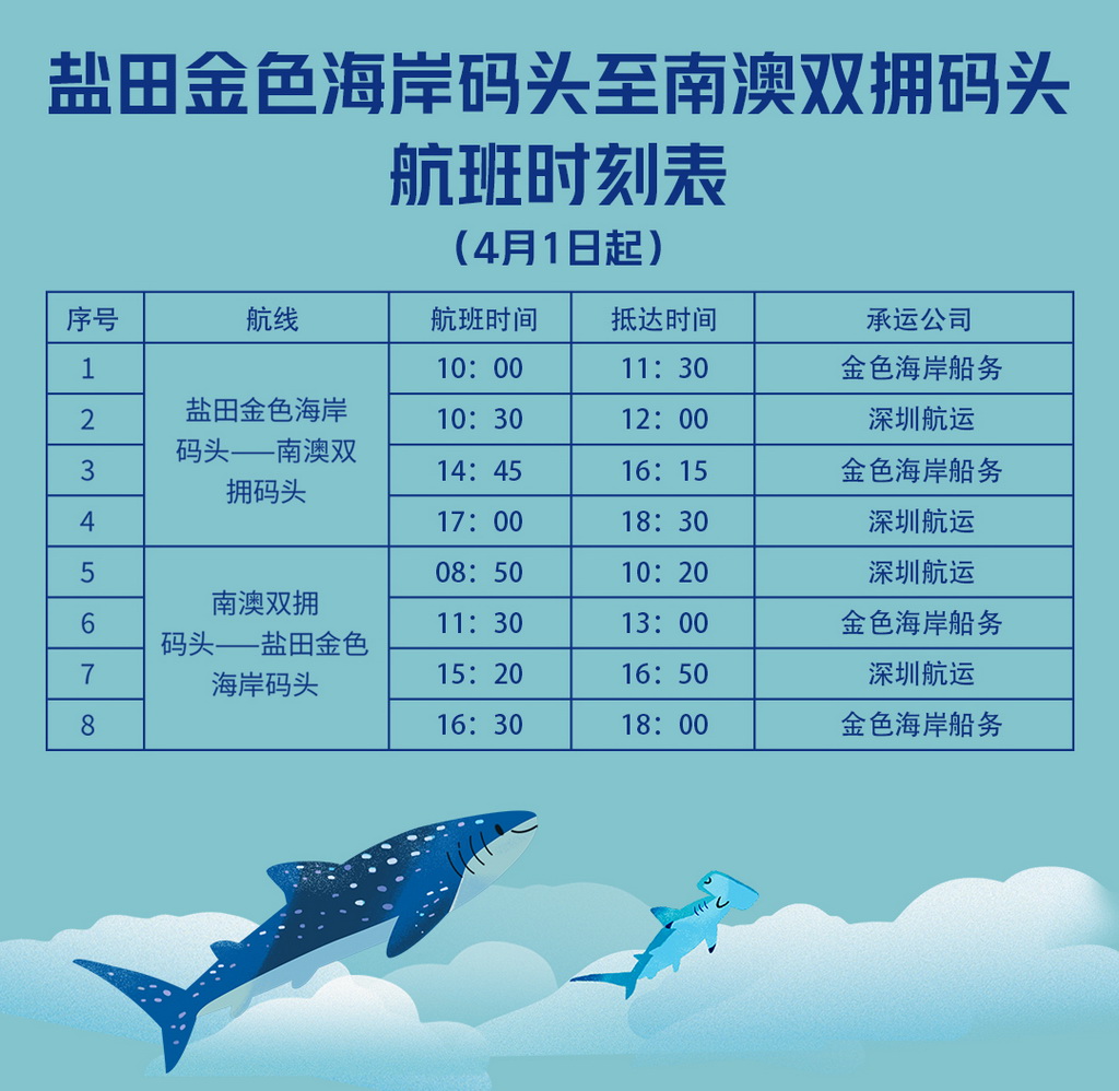 據(jù)了解,“鹽田-南澳”海上交通往返航線自3月12日正式復航,每天共4班。深圳航運集團增開后,該航線航班數(shù)量將恢復至疫情前的水平,達到每天8班。其中,由鹽田金色海岸碼頭至南澳雙擁碼頭新增航班時間為:10時30分和17時;由南澳雙擁碼頭至鹽田金色海岸碼頭新增航班時間為8時50分和15時20分。廣大市民及旅客朋友可通過深圳航運旗下公眾號“鵬星會”查詢航班信息及訂票,單程成人票60元/人。
