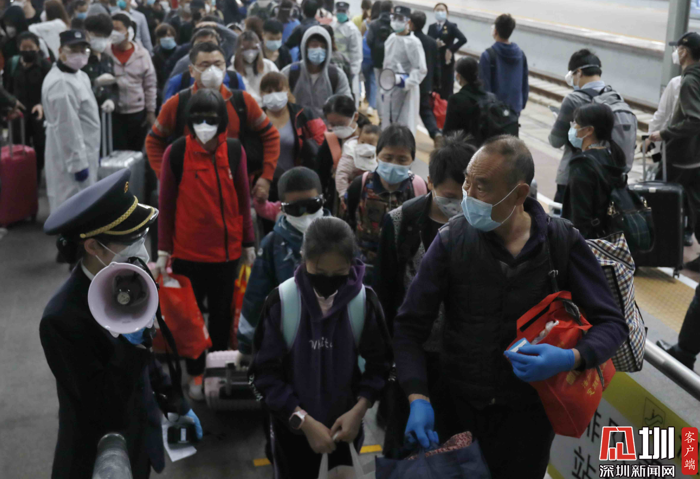 深圳北站西廣場(chǎng)出站口,三位“全副武裝”的旅客。