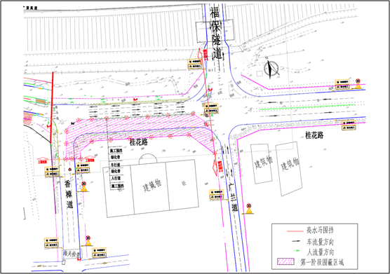 第一階段:對(duì)桂花路(福保隧道-香樟道段)南半幅(靠紅樹福苑側(cè))進(jìn)行封閉占用施工,北半幅臨時(shí)調(diào)整為三車道,一車道西行(進(jìn)保稅區(qū)方向),兩車道東行(出保稅區(qū)方向)。行人及非機(jī)動(dòng)車輛可通過(guò)現(xiàn)狀公園側(cè)人行道或紅樹福苑退線空間通行。自4月20日起,本階段預(yù)計(jì)持續(xù)施工60天。