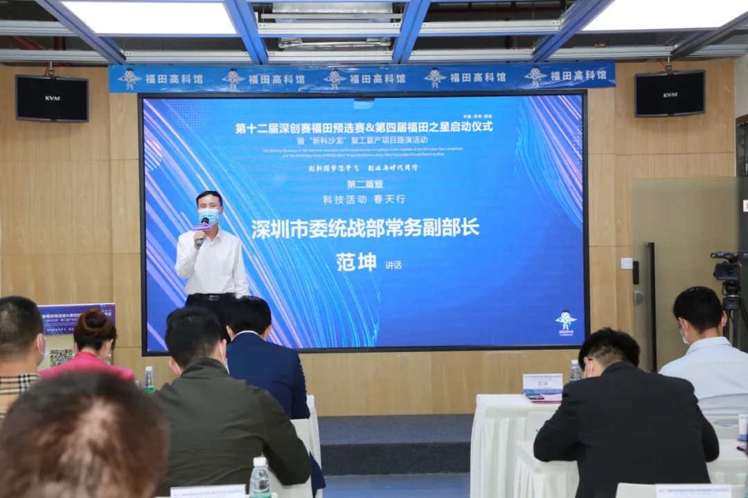 隨后,范坤與福田區(qū)科技創(chuàng)新局局長張忠暉等共同上臺啟動第十二屆深創(chuàng)賽福田預選賽暨第四屆“福田之星”大賽,同時為福田高科館授予“福田科技港灣”牌匾。