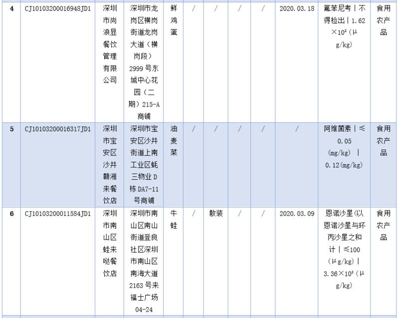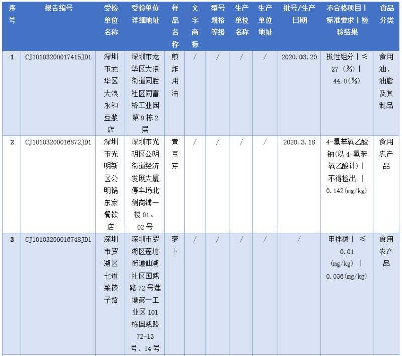 見圳客戶端·深圳新聞網(wǎng)2020年5月1日訊(深圳特區(qū)報記者 楊德琦)4月30日,深圳市市場監(jiān)督管理局發(fā)布第十四期食品安全抽樣檢驗情況通報,3月共抽檢餐飲環(huán)節(jié)食品1009批次,涉及餐飲環(huán)節(jié)經(jīng)營主體919家次,共檢測食品指標6347項次。其中不合格樣品8批次,涉及不合格食品類別有食用農(nóng)產(chǎn)品6批次,黃豆芽、蘿卜、雞蛋、油麥菜、牛蛙等在列;餐飲食品1批次,為即食白米飯;食用油、油脂及其制品1批次,為煎炸用油。涉及不合格項目類別為獸藥殘留、農(nóng)藥殘留、非食用物質(zhì)、微生物污染、品質(zhì)指標。