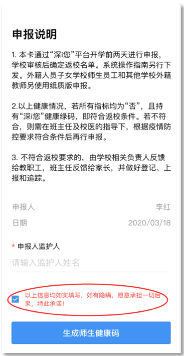 ③完成健康信息申報,包括選擇家庭住址、申報健康情況、填寫監(jiān)護人姓名等,請勾選申報承諾,點擊“生成師生健康碼”即可完成健康申報。