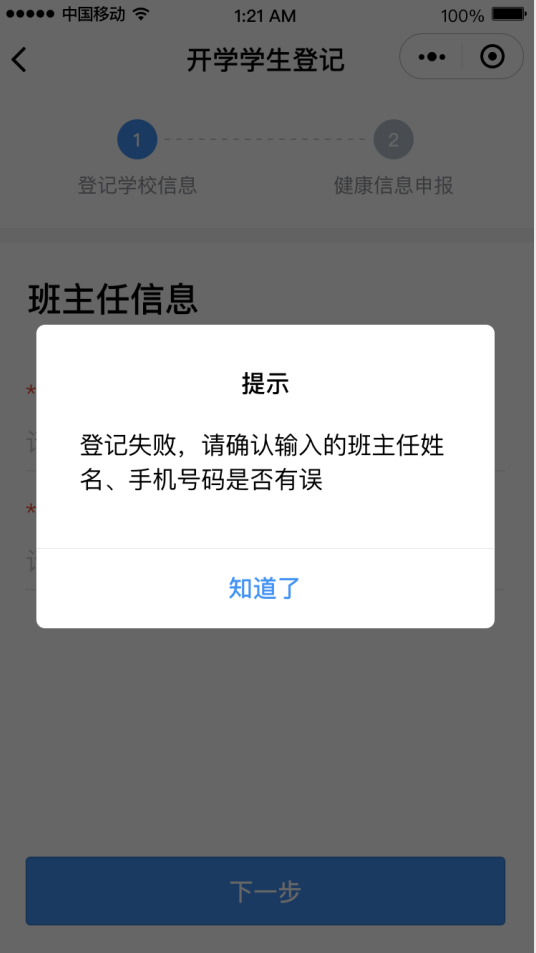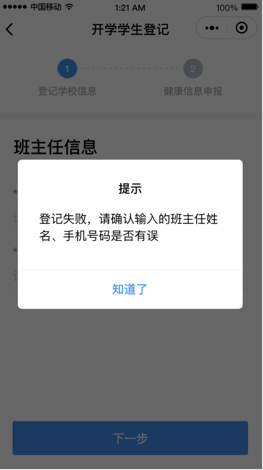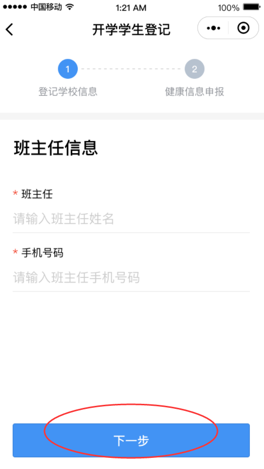 ③完成后進入“開學(xué)學(xué)生登記”頁面,選擇學(xué)生名字旁邊的“馬上登記”,填寫班主任姓名和手機號碼后點擊“下一步”。