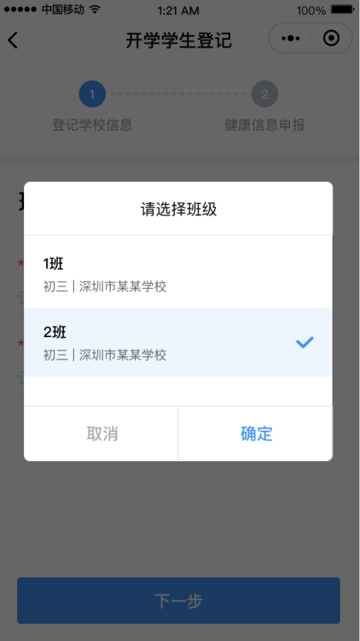 ②進入“學(xué)生登記”頁面,點擊“馬上登記”按鈕,填寫班主任姓名和手機號碼后點擊“下一步”,然后選擇對應(yīng)的班級,進入健康申報卡界面。