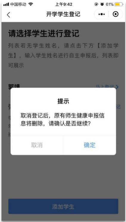 ②點(diǎn)擊“取消登記”,平臺(tái)彈出提示“取消登記后,原有師生健康申報(bào)信息將刪除,請確認(rèn)是否繼續(xù)?”,點(diǎn)擊“確定”,即取消成功。取消成功后,可重新進(jìn)行開學(xué)登記。