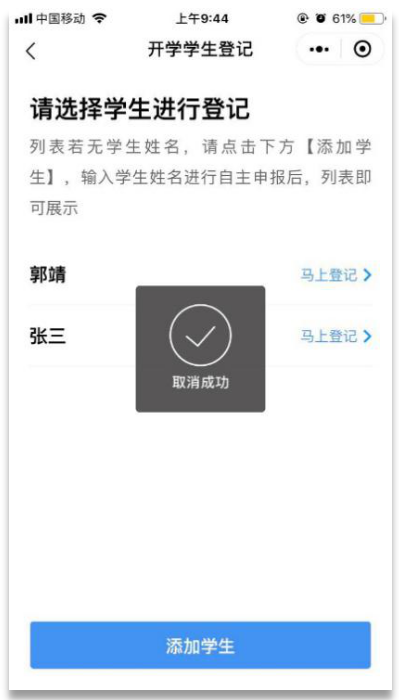 ①點(diǎn)擊“學(xué)生登記”,進(jìn)入開學(xué)學(xué)生登記列表,展示申報(bào)人員列表,選擇對應(yīng)的人員進(jìn)行取消登記。