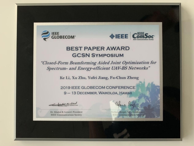 日前,由哈工大(深圳)電子與信息工程學(xué)院2017級碩士研究生李可擔(dān)任第一作者,朱旭教授、蔣宇飛助理教授、鄭福春教授為共同作者,哈工大(深圳)為第一通訊單位完成的論文《三維波束成形輔助的高譜效和能效的無人機(jī)基站網(wǎng)絡(luò)的聯(lián)合優(yōu)化》(“Closed-Form Beamforming Aided Joint Optimization for Spectrum- and Energy-Efficient UAV-BS Networks”)入選通信領(lǐng)域頂級會議Globecom2019 (IEEE Global Communications Conference2019),并獲得最佳論文獎。