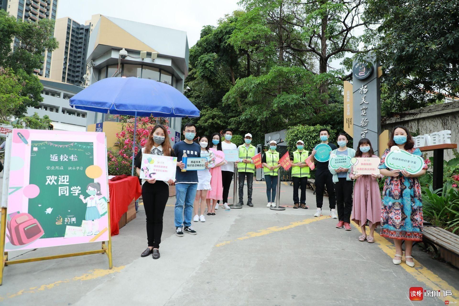 揚(yáng)美實(shí)驗(yàn)的老師們捧著特制歡迎牌,向返校的孩子們問好。家長(zhǎng)義工們身穿綠馬甲、手持小紅旗,在校門附近疏通交通,為孩子們保駕護(hù)航。揚(yáng)美學(xué)子佩戴口罩,按照錯(cuò)峰時(shí)間表通過體溫測(cè)量?jī)x,有序進(jìn)入校園。
