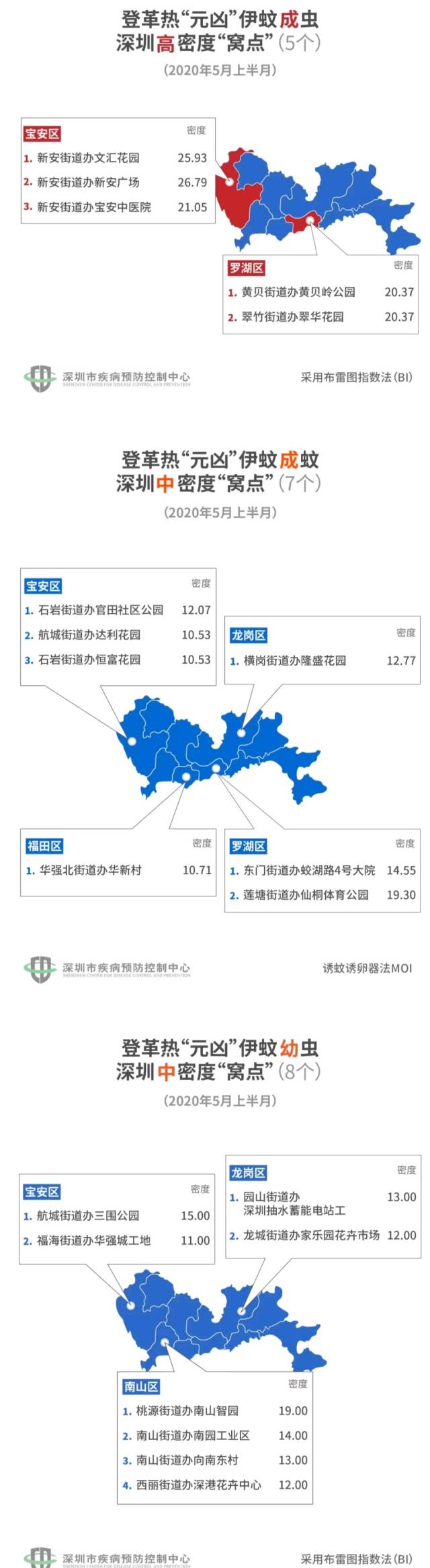 5月18日,深圳市疾控中心發(fā)布了5月上半月(5月1日-15日)的全市伊蚊密度監(jiān)測(cè)結(jié)果,高、中密度的20個(gè)“窩點(diǎn)”里,有8個(gè)是居民小區(qū),其余多為公園、工地,還有1個(gè)是醫(yī)院。