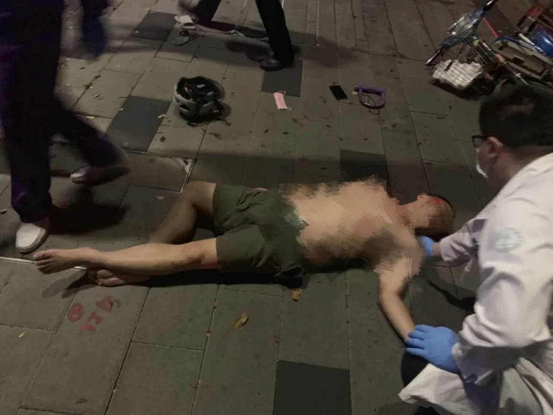 該男子上半身裸露橫躺在人行道上,而且臉上、身上多處擦傷,右眼淤青紅腫,旁邊還有一輛損壞的兩輪電動(dòng)車,坐墊、鎖鏈、頭盔散落一地。