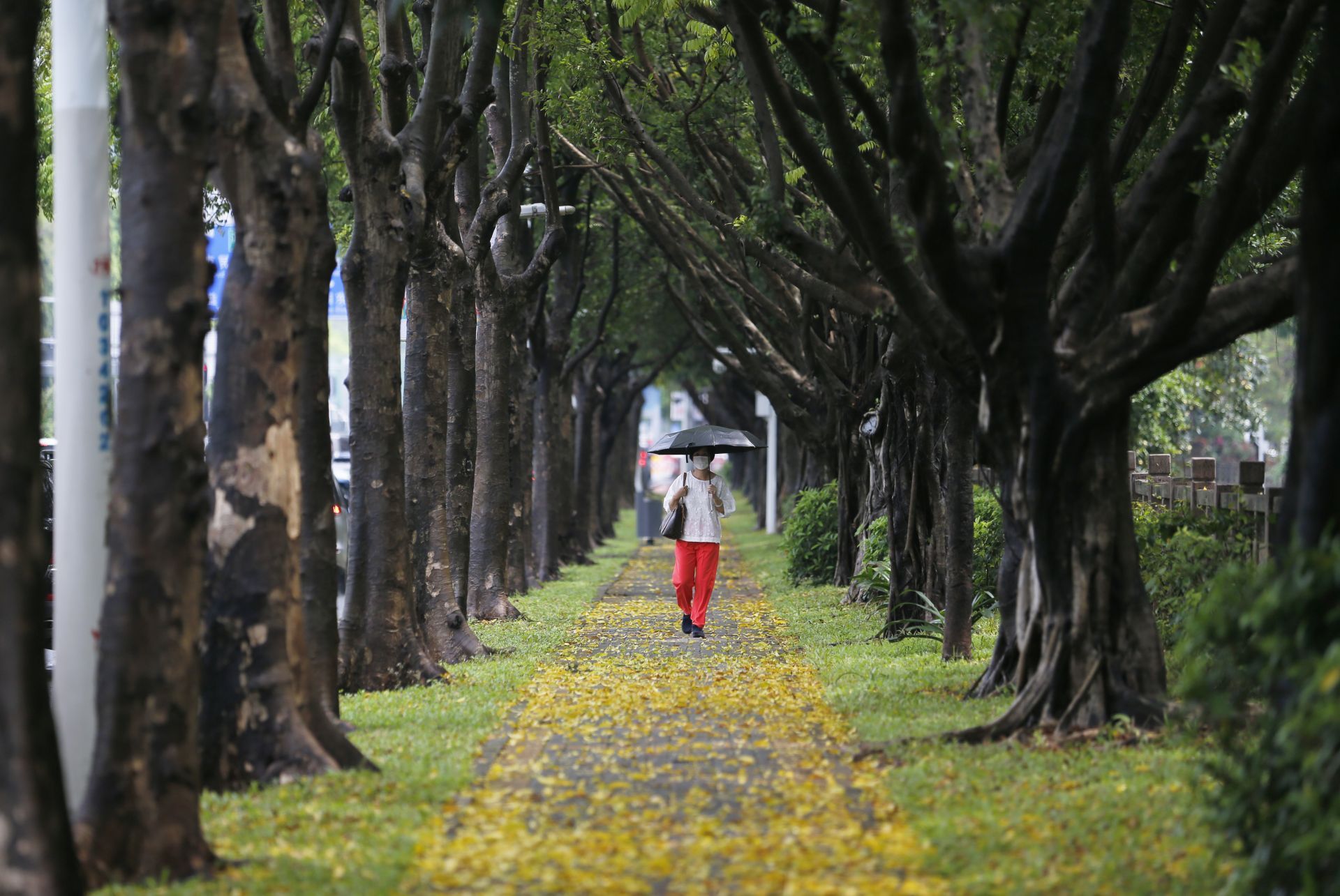 2020年5月26日中午13:46分,商報東二路附近,短時強降水加上刮風,路面上都是樹葉,一位市民經(jīng)過。