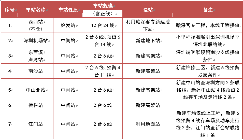 項(xiàng)目共設(shè)西麗(不含)、深圳機(jī)場(chǎng)、濱海灣、南沙、中山北、橫欄、江門等7個(gè)車站,其中西麗、深圳機(jī)場(chǎng)為地下站,濱海灣、南沙、中山北、橫欄為高架站,江門站為地面站。