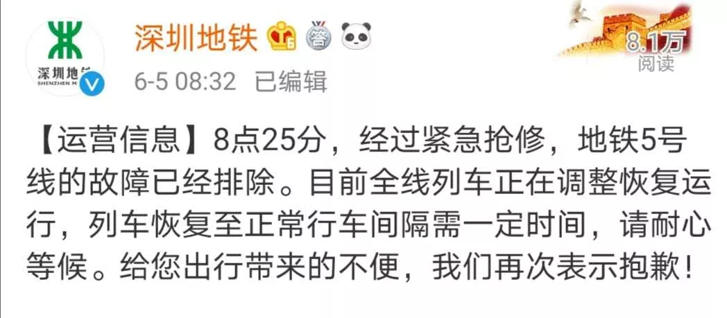@深圳地鐵發(fā)布信息:8點(diǎn)25分,經(jīng)過緊急搶修地鐵5號線的故障已經(jīng)排除。目前全線列車正在調(diào)整恢復(fù)運(yùn)行。
