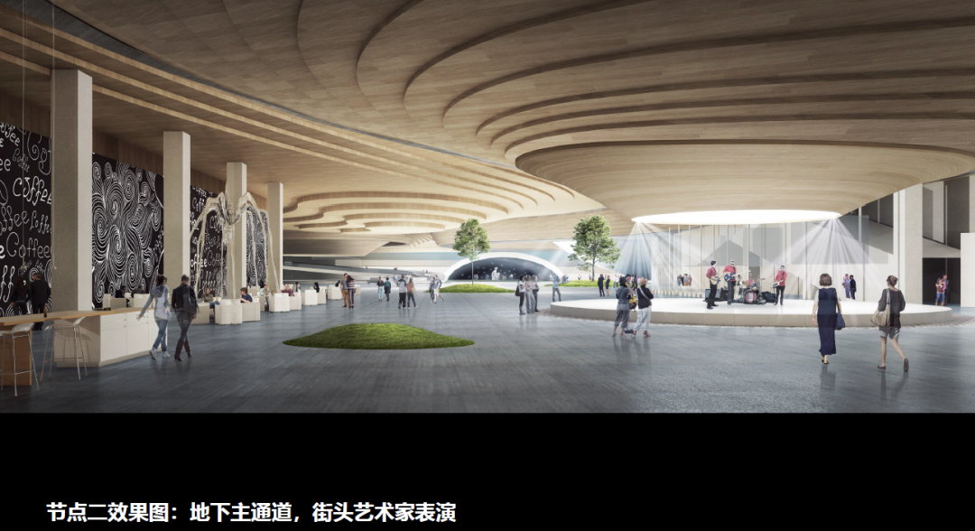 穿過洞穴般的地鐵出口,景象瞬間開闊,陽光透過構(gòu)筑物和煦的灑下,伴著兩側(cè)綠植和藝術(shù)墻緩緩升到負(fù)一層,達(dá)到商業(yè)線性軸和藝術(shù)通道的交匯處。