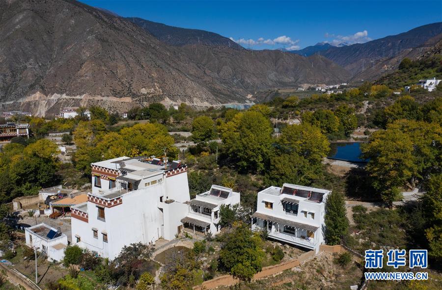 10月29日,四川省鄉(xiāng)城縣的定曲河峽谷的青德鄉(xiāng),民宿“皈院”錯落有致,保留白藏房傳統(tǒng)民居特色(無人機拍攝)。新華社記者江宏景攝