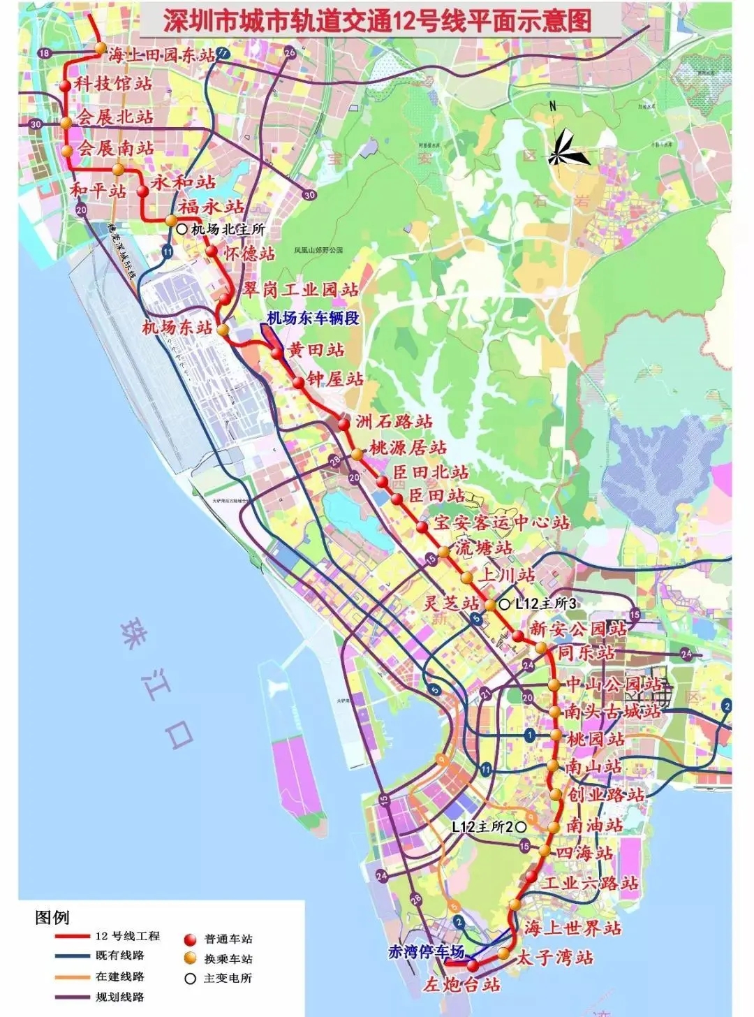 左炮臺-太子灣-海上世界(換乘2)-工業(yè)六路-四海-南油-創(chuàng)業(yè)路-南山(換乘11)-桃園(換乘1)-南頭古城-中山公園-同樂-寶安中學(xué)-靈芝(換乘5)-上川-流塘-寶安客運中心-臣田南-臣田北-桃源居-洲石路-凱成二路-黃田-機(jī)場東(換乘1)-翠崗工業(yè)園-懷德-福永(換乘11)-同富-和平-會展南-會展北-科技館-海上田園東