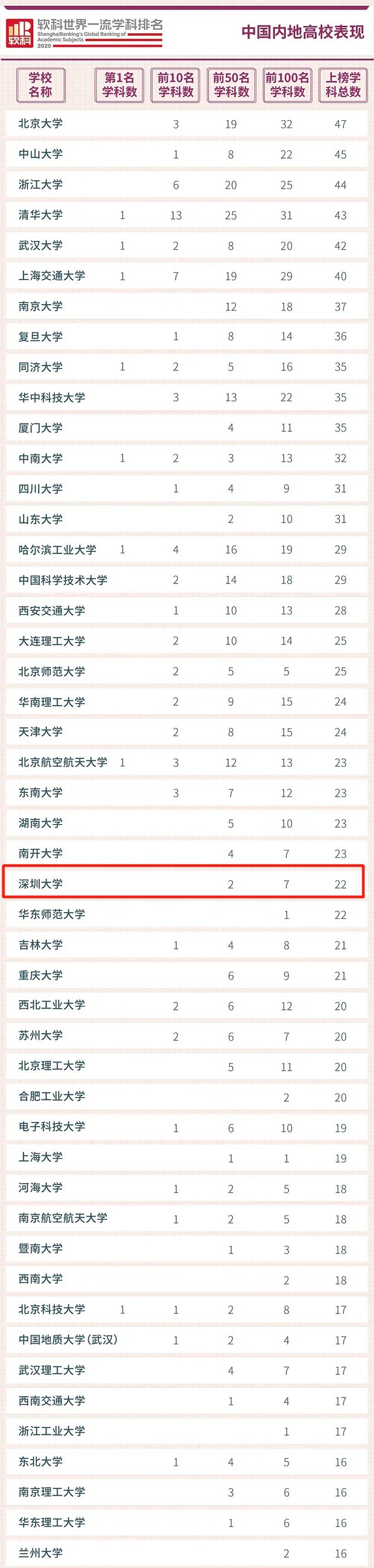 見圳客戶端·深圳新聞網(wǎng)2020年6月29日訊(見圳客戶端、深圳新聞網(wǎng)記者 梁榆其 金洪竹)6月29日,軟科正式發(fā)布2020“軟科世界一流學科排名”,排名覆蓋54個學科,涉及理學、工學、生命科學、醫(yī)學和社會科學五大領(lǐng)域,中國內(nèi)地共有253所高校上榜。深圳大學(以下簡稱“深大”)共有22個學科上榜,上榜學科數(shù)領(lǐng)跑地方高校,總上榜學科數(shù)位列中國內(nèi)地高校26位,其中,7個學科位列世界百強,2個學科進入世界50強。