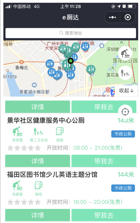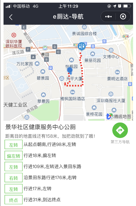 第三個功能為導(dǎo)航找?guī)?。既然已?jīng)查看到周邊有廁所分布,怎能不知道具體線路呢?“e廁達”中的“帶我去”按鈕可以輕松引領(lǐng)你去往定位的公廁。