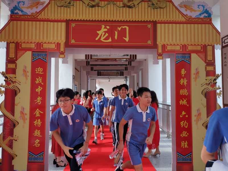 龍崗六約學(xué)校全體行政人員與九年級老師,穿著紅色送考服送考,寓意“鴻運當(dāng)頭”。九年級學(xué)生走過龍門,踏上紅地毯,自帶炫酷出場bgm。(記者李麗、周紅聲)