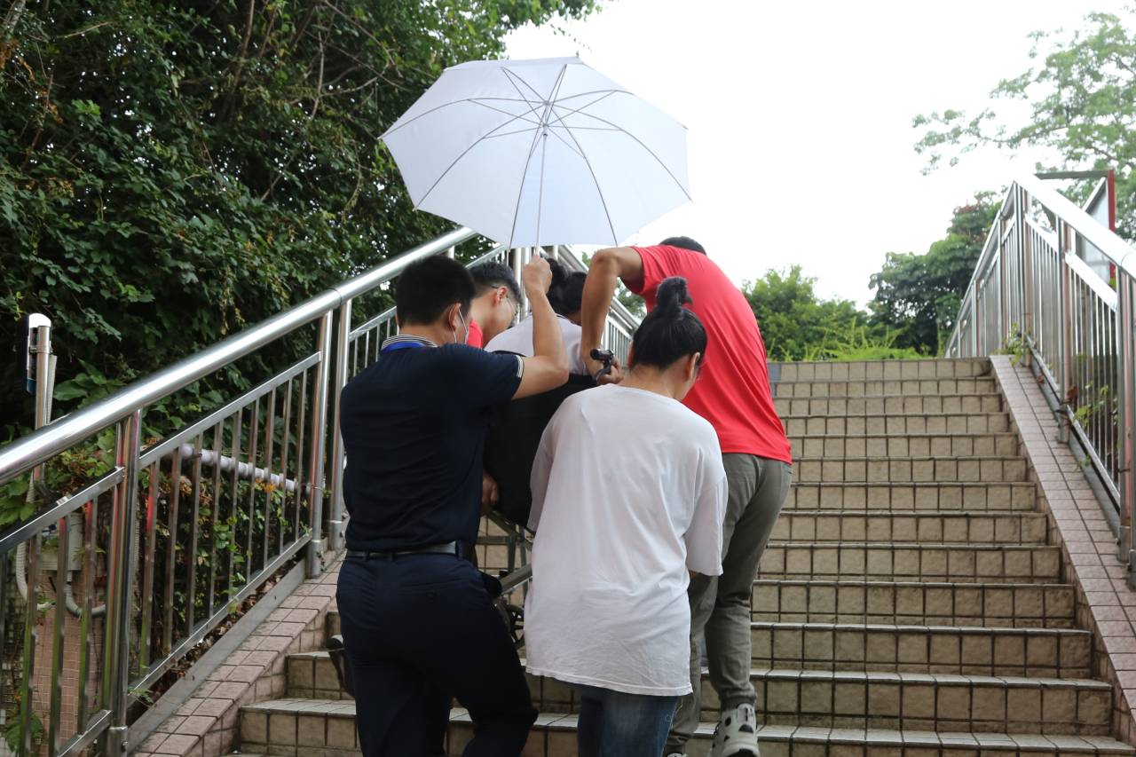 東升學(xué)校考點有一位行動不便的考生,學(xué)校派三名工作人員提前護送考生到考場。 (記者李麗、周紅聲)