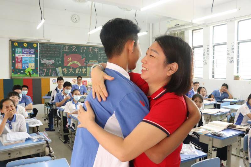 坪山同心外國語學(xué)校授課老師加油打氣:和語文老師擁抱,考試滿分! (焦子宇 耿超逸文/圖)