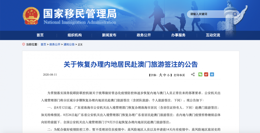一、自8月12日起,廣東省珠海市公安機關(guān)出入境管理部門恢復(fù)辦理珠海市居民(含居住證持有人,下同)赴澳門旅游簽注;如無特殊情況,8月26日起,廣東省公安機關(guān)出入境管理部門恢復(fù)辦理廣東省居民赴澳門旅游簽注;在內(nèi)地與澳門疫情形勢繼續(xù)總體向好的前提下,全國公安機關(guān)出入境管理部門于9月23日起恢復(fù)辦理內(nèi)地居民赴澳門旅游簽注。