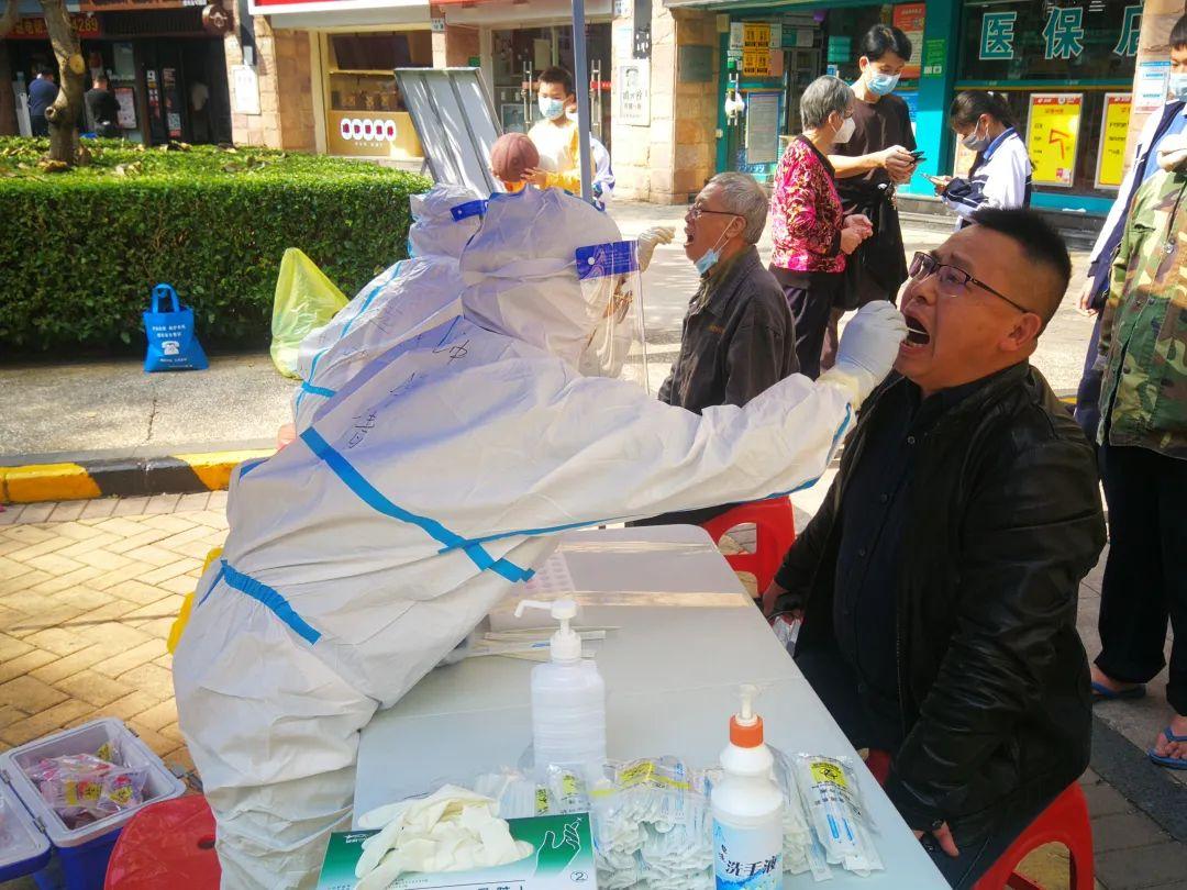 ▲據(jù)東方半島社區(qū)半島苑居民反映,早上6點(diǎn)多,趕著上班的市民在接到社區(qū)"要做核酸檢測"的通知后,馬上下樓排隊(duì)等待醫(yī)護(hù)人員的到來,工作、防疫兩不誤。