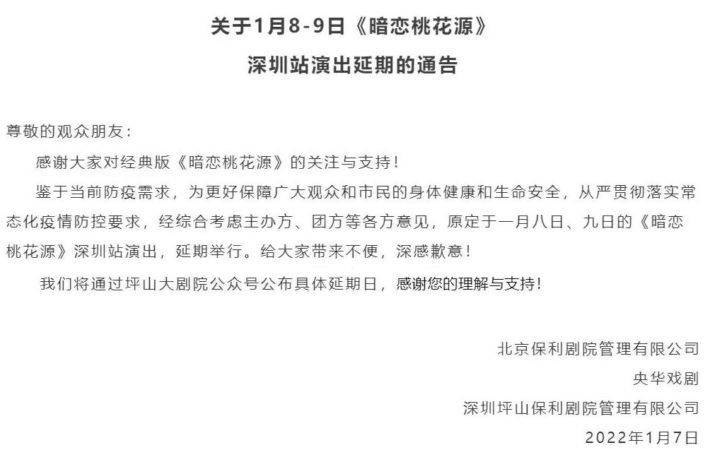 為配合疫情防控要求,減少因人群聚集帶來的病毒傳播風(fēng)險,切實(shí)保障人民群眾生命安全,原定于2022年1月7日19:30在深圳戲院劇場(一號廳)舉行的大型粵劇《情僧偷到瀟湘館》演出取消,敬請知悉。