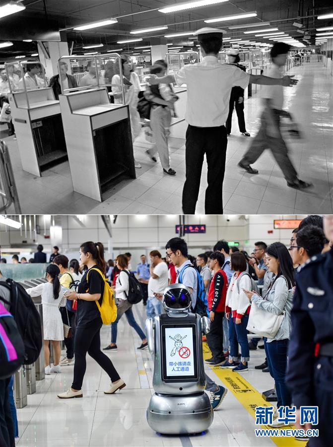 拼版照片:上圖為旅客經(jīng)過深圳羅湖口岸(資料照片,新華社記者陳小波攝);下圖為2018年4月6日,在深圳灣口岸出境大廳,機器人在自助查驗通道前對旅客進行提示(新華社記者毛思倩攝)。新華社發(fā)