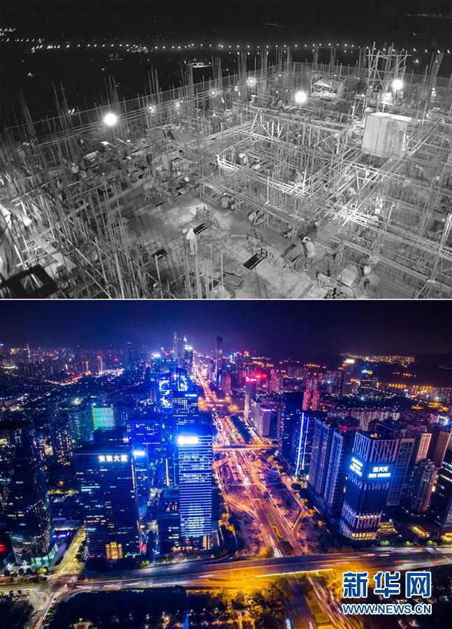 拼版照片:上圖為建筑工人在深圳國際貿(mào)易中心大廈工地工作(資料照片,新華社記者陳學(xué)思攝);下圖為2017年2月14日無人機拍攝的深圳夜景(新華社記者毛思倩攝)。新華社發(fā)