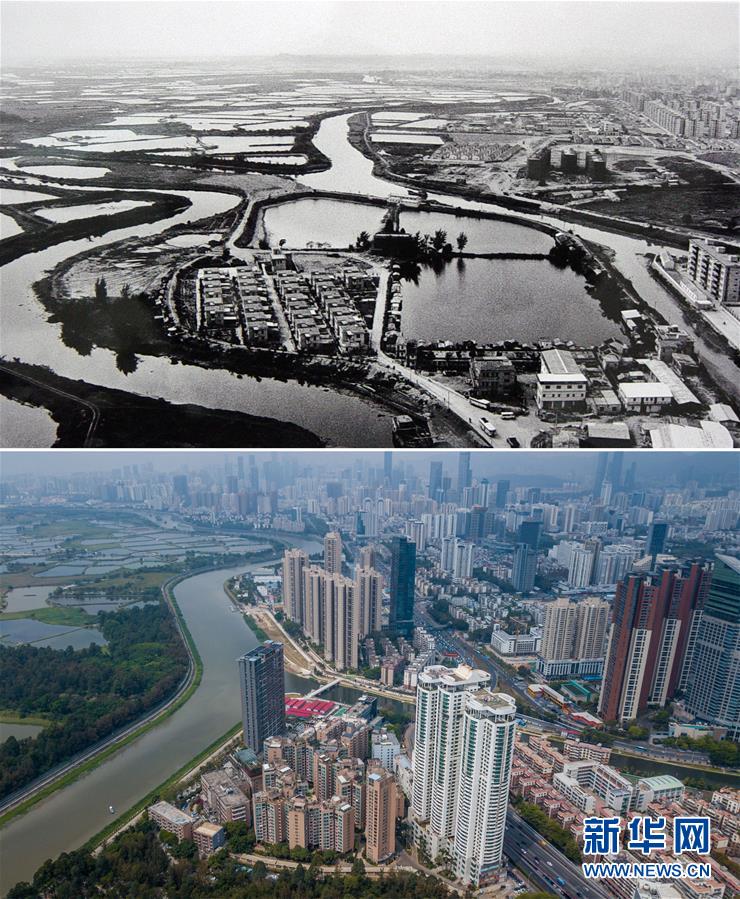 拼版照片:上圖為上世紀80年代初的深圳漁民村(資料照片,新華社發(fā));下圖為2018年3月26日無人機拍攝的漁民村(畫面前面的高樓,新華社記者毛思倩攝)。漁民村坐落于深圳河畔,從上世紀70年代水草飄零的漁船人家到改革開放以來中國第一個“萬元戶村”,如今已經(jīng)變成加載高科技設(shè)備實現(xiàn)智能化管理的現(xiàn)代社區(qū)。新華社發(fā)