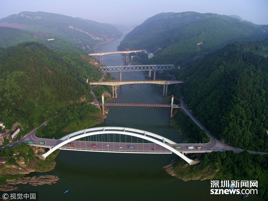 ??? 2018年5月18日,重慶,在嘉陵江重慶觀音峽段,間隔不到1000米的江面上橫跨著五座大橋,形成了五橋“疊翠”的美麗景觀,生動(dòng)展示了“橋都”重慶的變化。