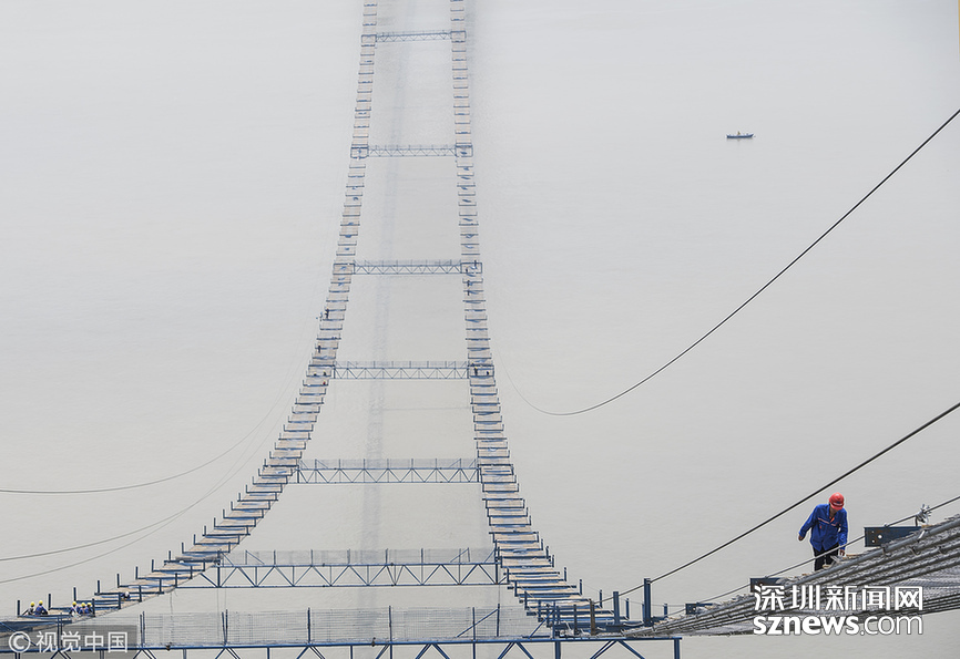 ???? 2018年5月14日,武漢,武漢楊泗港長(zhǎng)江大橋上空,上部結(jié)構(gòu)施工進(jìn)入貓道面網(wǎng)鋪設(shè)階段,數(shù)十名中鐵大橋局工人在跨江高空拼搏趕超,江面上空的臨時(shí)“吊橋”悄然形成。數(shù)十名工人在長(zhǎng)江上空228米處拼搏趕超,臨時(shí)“天梯”悄然形成。