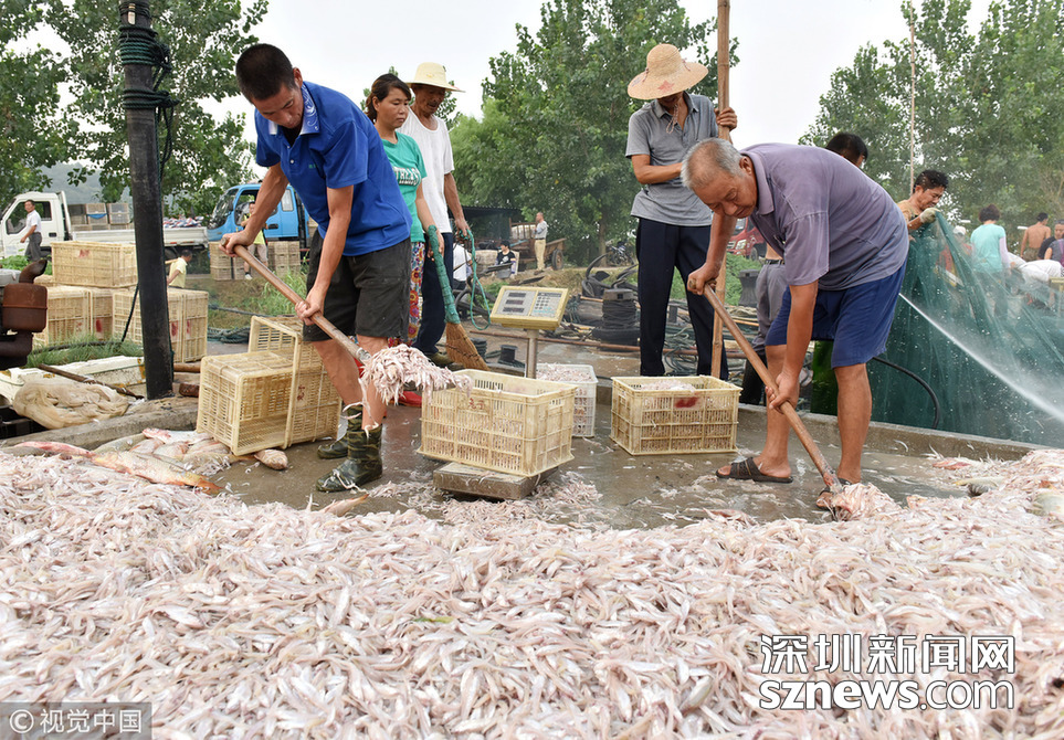 2018年8月16日,安徽巢湖漁民正在裝運捕撈上來的毛魚和銀魚。 初秋時節(jié),正值安徽省巢湖水域毛魚和銀魚大量上市季節(jié),從8月15日下午4時起,巢湖迎來一年中最大的秋季魚汛,沿湖1600多戶漁民開始下湖捕撈作業(yè)。