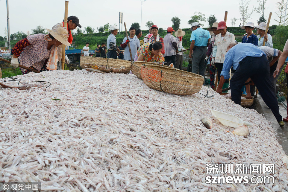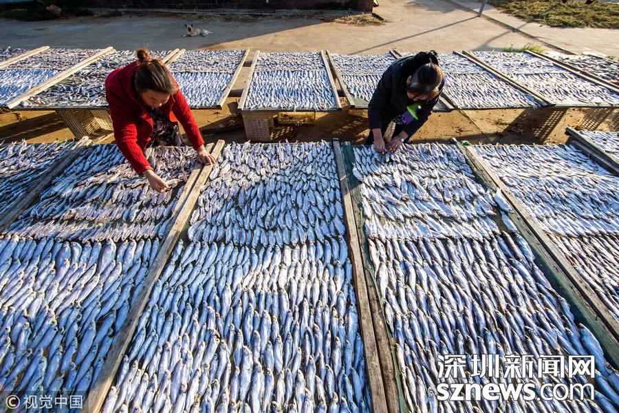 江西都昌縣薌溪鄉(xiāng)的漁民趁著晴好天氣翻曬捕撈上岸的魚蝦。