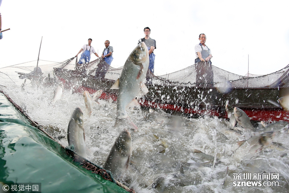 2018年6月26日,江蘇省常州市嘉澤鎮(zhèn)捕撈村的漁民組織夏季捕撈,一網魚達五萬余斤,以鰱魚為主,供應市場需求。夏捕的魚價較平時有所上漲,漁民粗略估計可增收上萬余元。