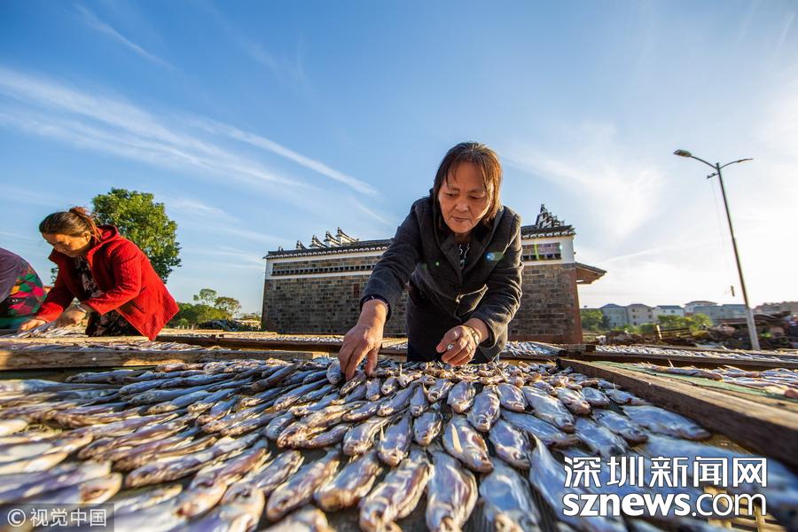 江西都昌縣薌溪鄉(xiāng)的漁民趁著晴好天氣翻曬捕撈上岸的魚蝦。