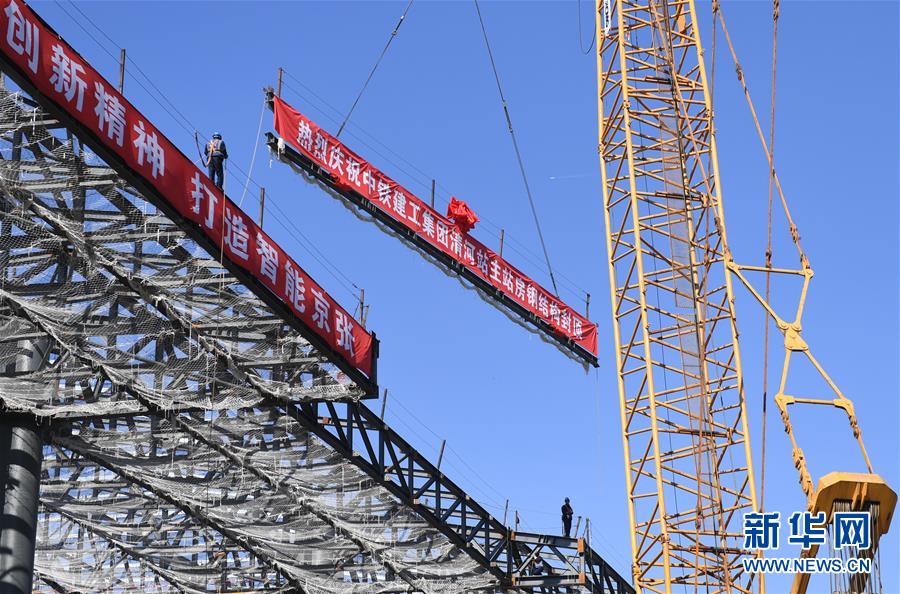 10月17日,工作人員在吊裝最后一組鋼梁。當(dāng)日,京張高鐵新建車站——清河站主體結(jié)構(gòu)正式封頂。清河站是京張高鐵建筑面積最大的車站,同時也是京張高鐵在北京地區(qū)的始發(fā)站之一。 新華社記者 張晨霖 攝
