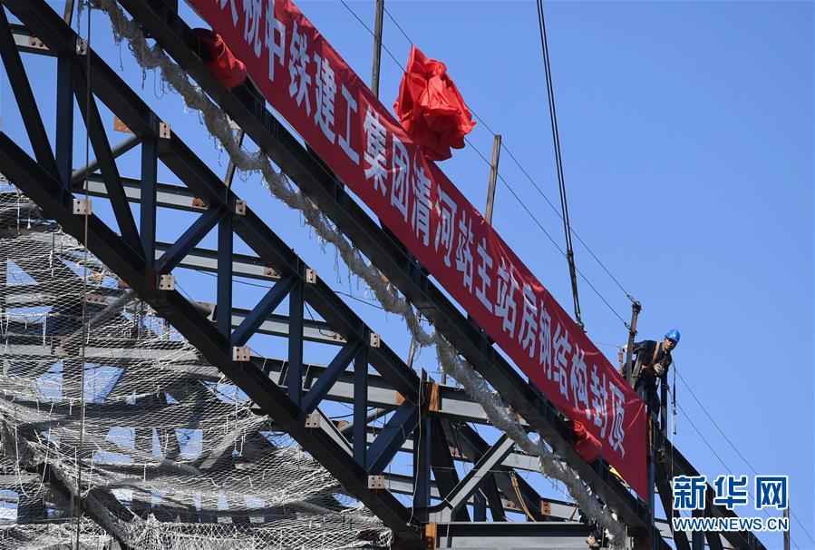 最后一組鋼梁吊裝到位(10月17日攝)。當(dāng)日,京張高鐵新建車站——清河站主體結(jié)構(gòu)正式封頂。清河站是京張高鐵建筑面積最大的車站,同時(shí)也是京張高鐵在北京地區(qū)的始發(fā)站之一。 新華社記者 張晨霖 攝