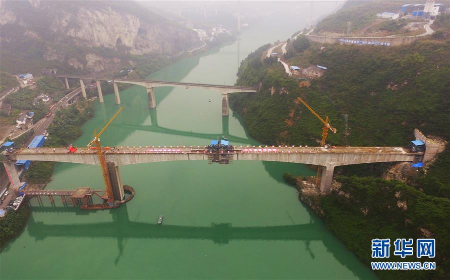 在重慶涪陵拍攝的渝懷鐵路涪秀二線重點(diǎn)工程——烏江右線大橋(10月23日無(wú)人機(jī)拍攝)。 10月23日,由中鐵四局承建的渝懷鐵路涪秀二線重點(diǎn)工程——烏江右線大橋主跨成功合龍,標(biāo)志著大橋主體工程全部順利結(jié)束。烏江右線大橋項(xiàng)目全程460.1米,主跨192米,跨越烏江和319國(guó)道。在兩年多的建設(shè)過(guò)程中,施工人員攻克了“不等高墩”“不對(duì)稱邊跨”“邊跨入隧”等多個(gè)技術(shù)難題。 新華社記者王全超攝
