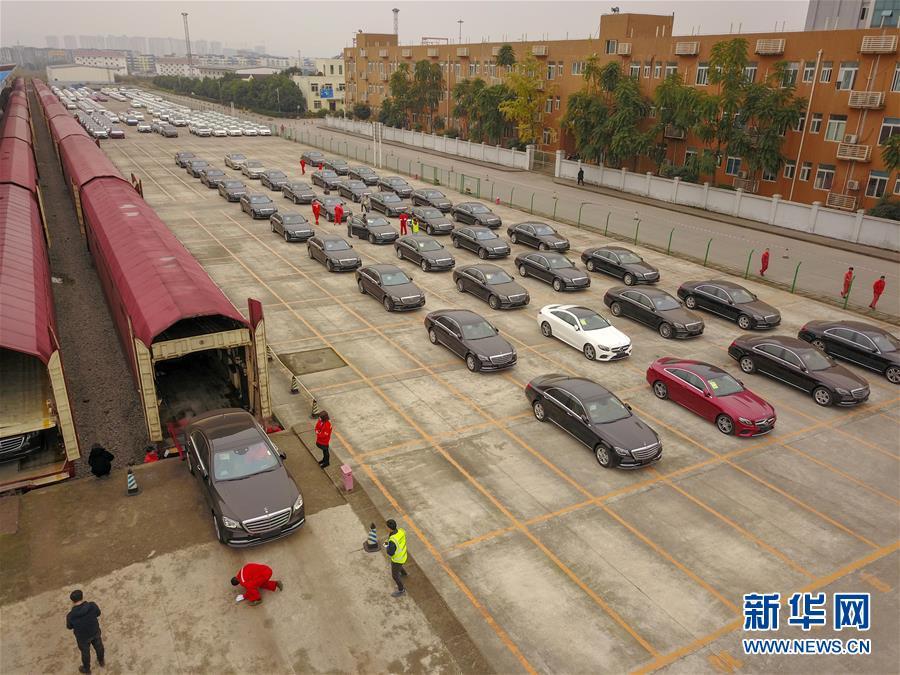 11月19日,在重慶團(tuán)結(jié)村站貨場(chǎng)內(nèi),首趟中歐班列商品車專用車運(yùn)輸國(guó)際班列在進(jìn)行卸貨作業(yè)(無人機(jī)拍攝)。 新華社記者 劉潺 攝