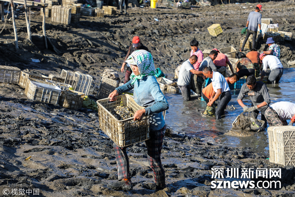 深圳新聞網(wǎng)訊 2018年9月8日,遼寧丹東,早上5點,挖蟶人紛紛下到各個池子,要在海水海泥里艱辛勞作10小時,直至下午3點集體上岸,等待買家的運輸車隊運走他們的勞動成果。9月初,遼寧沿海養(yǎng)殖區(qū)進入養(yǎng)殖海鮮的收獲季。在東港,常常出現(xiàn)數(shù)百人乃至上千人集結在池子里挖蟶子(這里特指縊蟶,即東港當?shù)厝怂f的小人仙。下同)的壯觀景象。在養(yǎng)殖海鮮的收獲季,成群的海鷗趁機“助陣“,人與大自然和諧共處的畫面令人嘆為觀止。